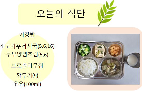 2025년 6월 5일 오늘의 식단 페이지 정보 작성자 슬기유치원 작성일25-06-05 16:13 조회3,725회 댓글0건 관련링크 이전글 다음글 목록 본문 2025년 6월 5일 오늘의 식단 댓글목록 등록된 댓글이 없습니다. 이전글 다음글 목록