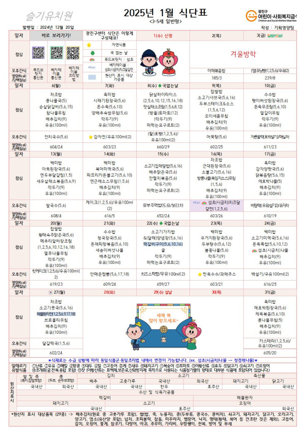 ★ 2025년 1월 식단표 ★ 페이지 정보 작성자 슬기유치원 작성일24-12-27 13:21 조회5,635회 댓글0건 관련링크 이전글 다음글 목록 본문 댓글목록 등록된 댓글이 없습니다. 이전글 다음글 목록