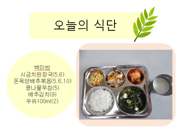2024년 11월 26일 오늘의 식단 페이지 정보 작성자 슬기유치원 작성일24-11-26 13:17 조회5,881회 댓글0건 관련링크 이전글 다음글 목록 본문 댓글목록 등록된 댓글이 없습니다. 이전글 다음글 목록