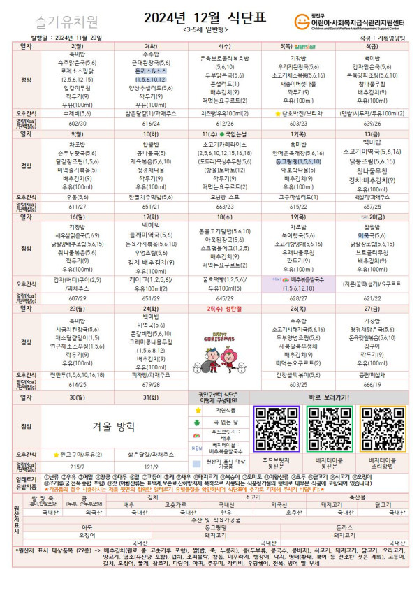 ★ 2024년 12월 식단표 ★ 페이지 정보 작성자 슬기유치원 작성일24-11-29 13:10 조회5,825회 댓글0건 관련링크 이전글 다음글 목록 본문 댓글목록 등록된 댓글이 없습니다. 이전글 다음글 목록