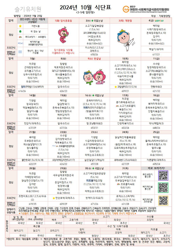 ★ 2024년 10월 식단표 ★ 페이지 정보 작성자 슬기유치원 작성일24-09-27 13:23 조회6,651회 댓글0건 관련링크 이전글 다음글 목록 본문 댓글목록 등록된 댓글이 없습니다. 이전글 다음글 목록