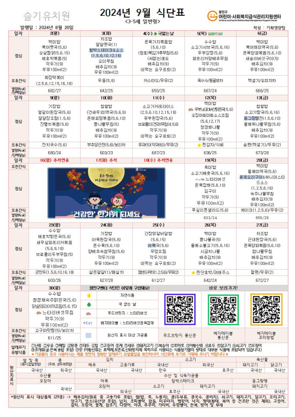 ★ 2024년 9월 식단표 ★ 페이지 정보 작성자 슬기유치원 작성일24-08-30 13:54 조회6,974회 댓글0건 관련링크 이전글 다음글 목록 본문 댓글목록 등록된 댓글이 없습니다. 이전글 다음글 목록
