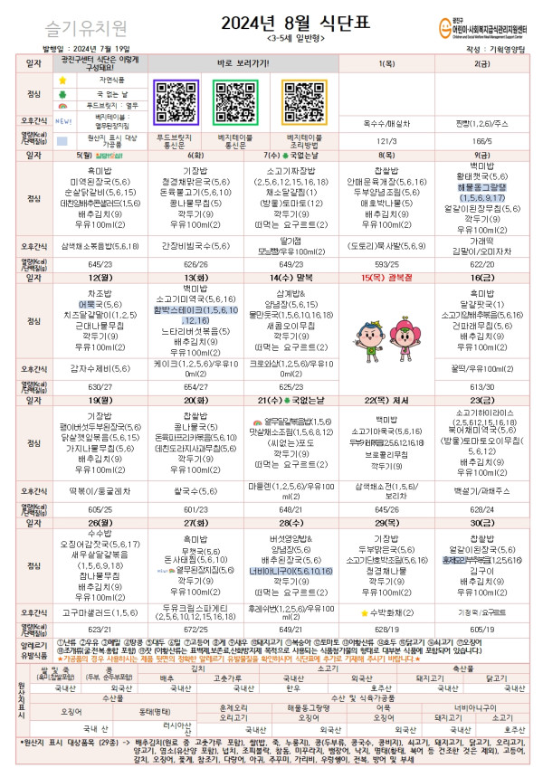 ★ 2024년 8월 식단표 ★ 페이지 정보 작성자 슬기유치원 작성일24-07-26 14:24 조회6,962회 댓글0건 관련링크 이전글 다음글 목록 본문 ★ 2024년 8월 식단표 ★ 댓글목록 등록된 댓글이 없습니다. 이전글 다음글 목록