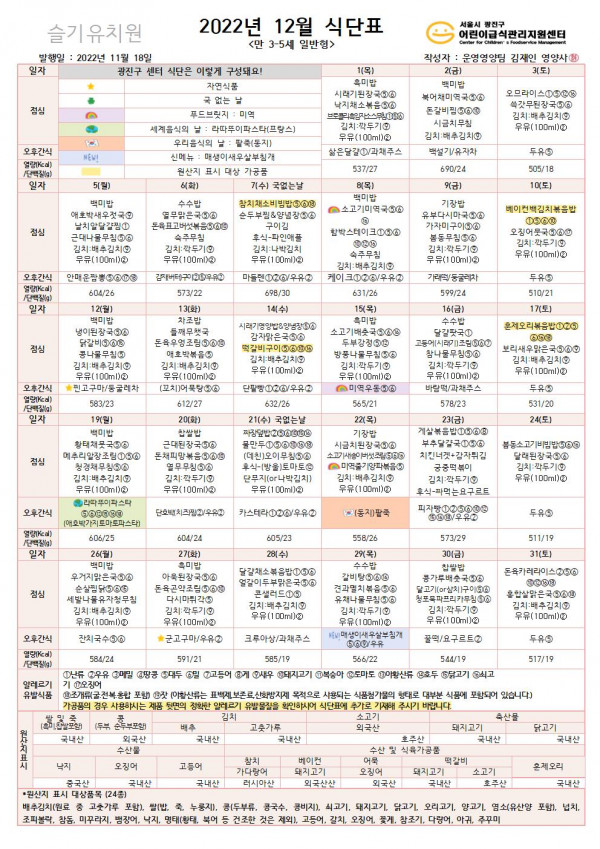 ★ 2022년 12월 식단표 ★ 페이지 정보 작성자 슬기유치원 작성일22-12-01 11:39 조회8,622회 댓글0건 관련링크 이전글 다음글 목록 본문 ★ 2022년 12월 식단표 ★ 댓글목록 등록된 댓글이 없습니다. 이전글 다음글 목록