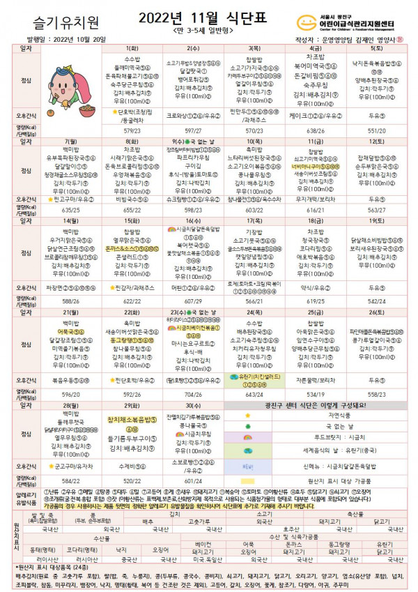 ★ 2022년 11월 식단표 ★ 페이지 정보 작성자 슬기유치원 작성일22-10-28 17:44 조회8,766회 댓글0건 관련링크 이전글 다음글 목록 본문 ★ 2022년 11월 식단표 ★ 댓글목록 등록된 댓글이 없습니다. 이전글 다음글 목록