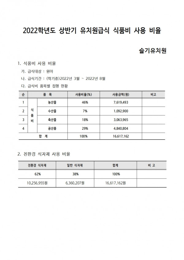 2022년 8월 축산물 이력 및 상반기 유치원급식 식품비 사용비율