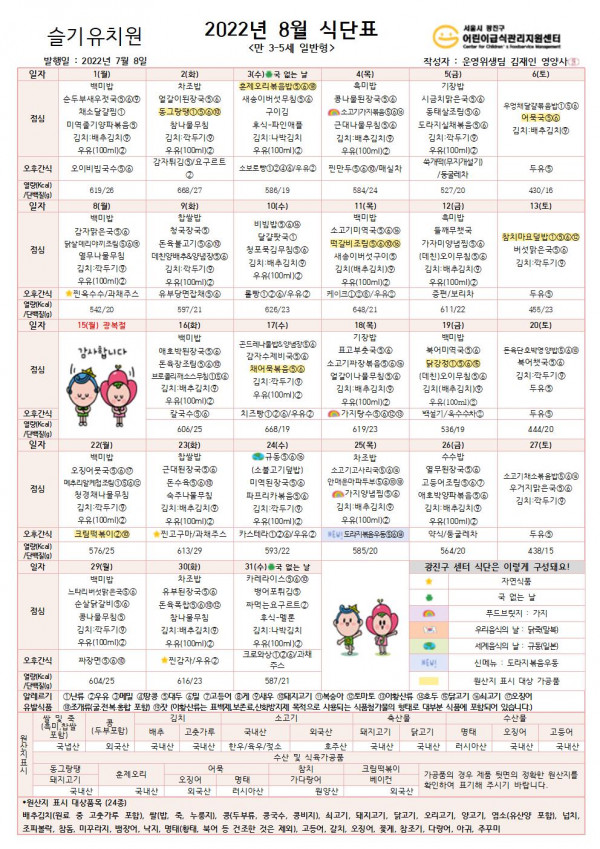 ★ 2022년 8월 식단표 ★ 페이지 정보 작성자 슬기유치원 작성일22-08-01 13:19 조회8,783회 댓글0건 관련링크 이전글 다음글 목록 본문 ★ 2022년 8월 식단표 ★ 댓글목록 등록된 댓글이 없습니다. 이전글 다음글 목록