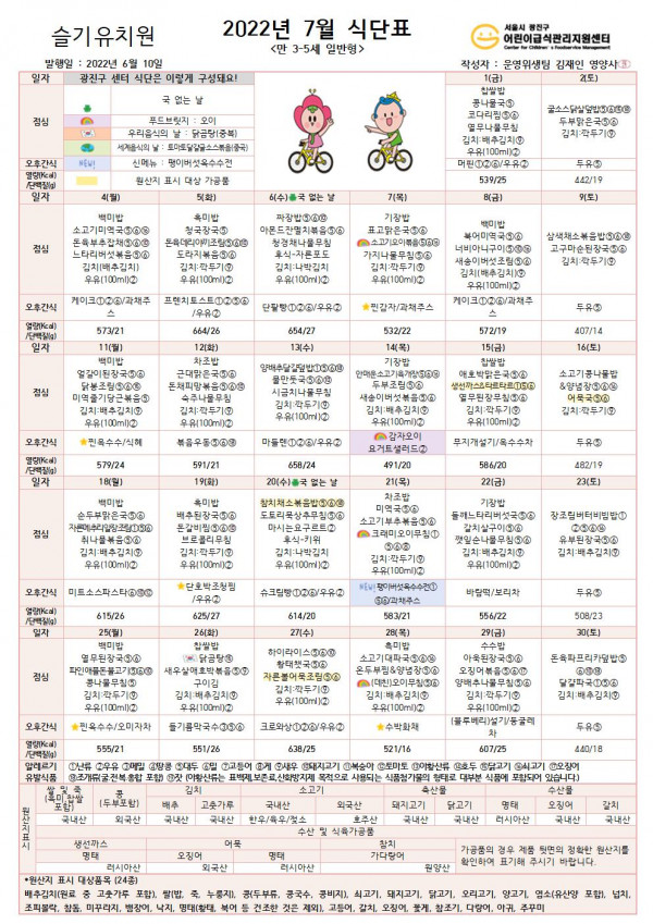 ★ 2022년 7월 식단표 ★ 페이지 정보 작성자 슬기유치원 작성일22-06-30 14:35 조회8,659회 댓글0건 관련링크 이전글 다음글 목록 본문 ★ 2022년 7월 식단표 ★ 댓글목록 등록된 댓글이 없습니다. 이전글 다음글 목록