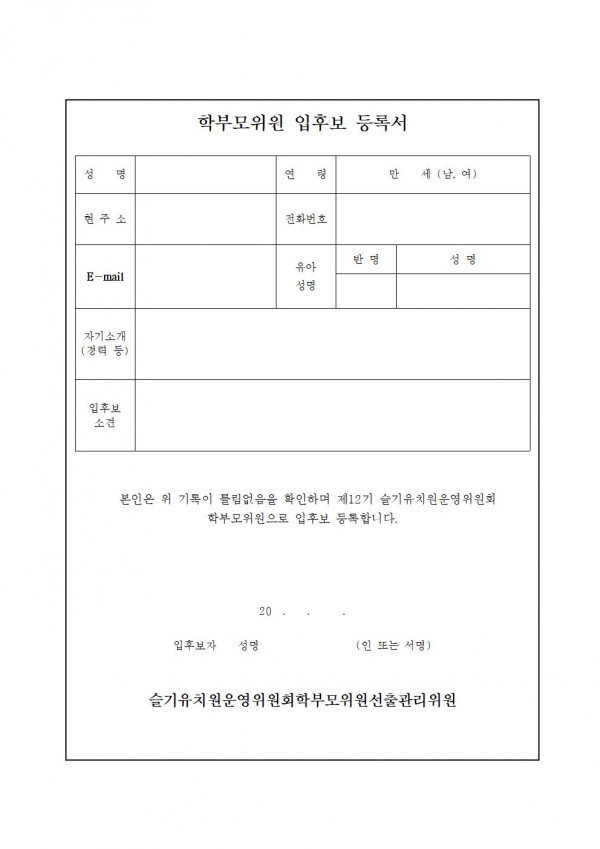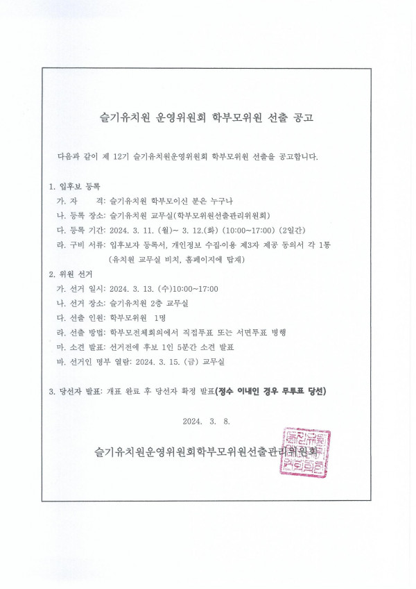 (운영위)제12기 운영위원회 선출 공고 페이지 정보 작성자 슬기유치원 작성일24-03-08 17:47 조회1,129회 댓글0건 관련링크 이전글 다음글 목록 본문 (운영위)제12기 운영위원회 선출 공고 댓글목록 등록된 댓글이 없습니다. 이전글 다음글 목록