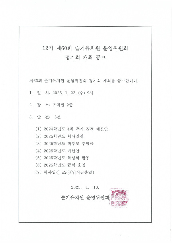 (운영위)제 60회 운영위원회 개최 공고 페이지 정보 작성자 슬기유치원 작성일25-01-17 13:27 조회865회 댓글0건 관련링크 이전글 다음글 목록 본문 댓글목록 등록된 댓글이 없습니다. 이전글 다음글 목록