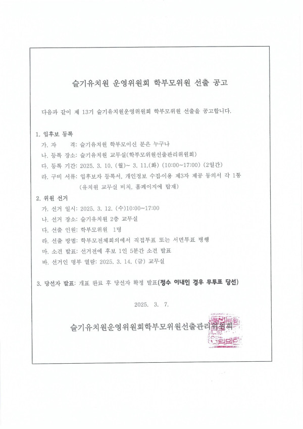 (운영위)제13기 운영위원회 선출 공고 페이지 정보 작성자 슬기유치원 작성일25-03-08 18:02 조회816회 댓글0건 관련링크 이전글 다음글 목록 본문 (운영위)제13기 운영위원회 선출 공고 댓글목록 등록된 댓글이 없습니다. 이전글 다음글 목록