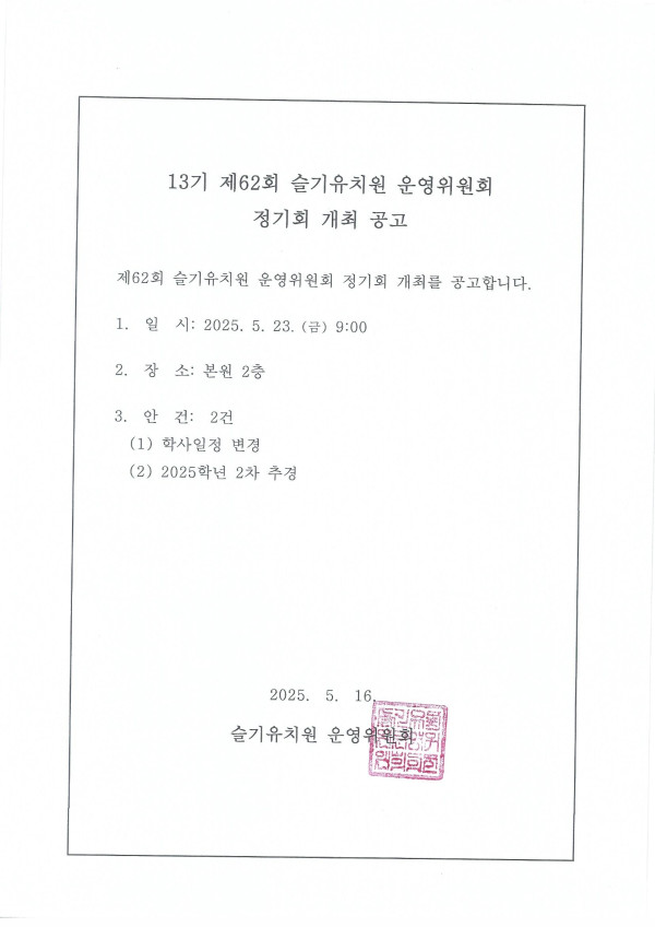 (운영위)제 62회 운영위원회 개최 공고 페이지 정보 작성자 슬기유치원 작성일25-05-18 06:38 조회706회 댓글0건 관련링크 이전글 다음글 목록 본문 (운영위)제 62회 운영위원회 개최 공고 댓글목록 등록된 댓글이 없습니다. 이전글 다음글 목록
