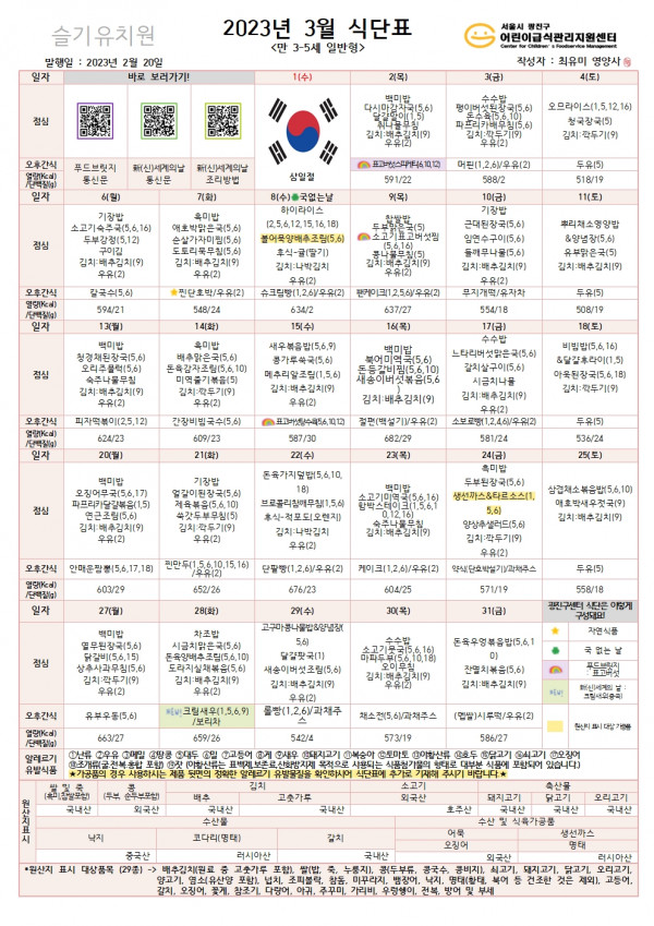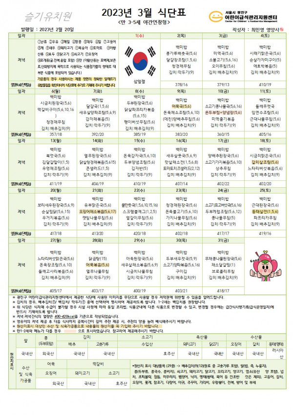 ★ 2023년 3월 식단표 ★ 페이지 정보 작성자 슬기유치원 작성일23-03-03 13:05 조회7,162회 댓글0건 관련링크 이전글 다음글 목록 본문 ★ 2023년 3월 식단표 ★ 댓글목록 등록된 댓글이 없습니다. 이전글 다음글 목록