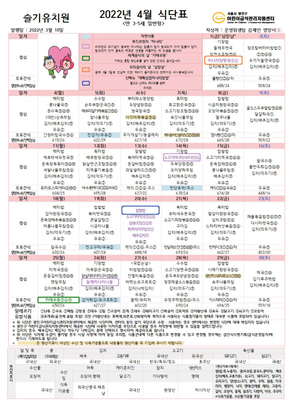 2022년 4월 식단표 페이지 정보 작성자 슬기유치원 작성일22-03-31 12:58 조회7,535회 댓글0건 관련링크 이전글 다음글 목록 본문 2022년 4월 식단표 댓글목록 등록된 댓글이 없습니다. 이전글 다음글 목록