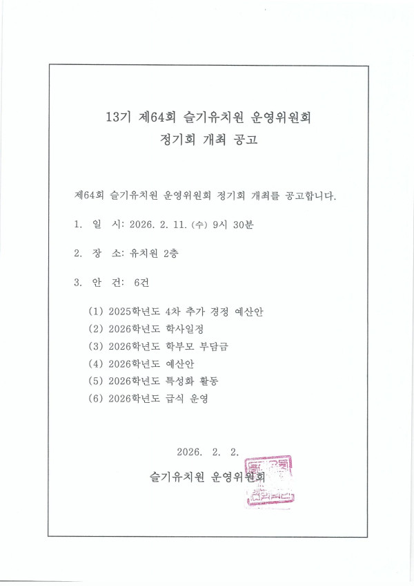 (운영위)제 64회 운영위원회 개최 공고 페이지 정보 작성자 슬기유치원 작성일26-01-30 10:06 조회49회 댓글0건 관련링크 이전글 다음글 목록 본문 (운영위)제 64회 운영위원회 개최 공고 댓글목록 등록된 댓글이 없습니다. 이전글 다음글 목록